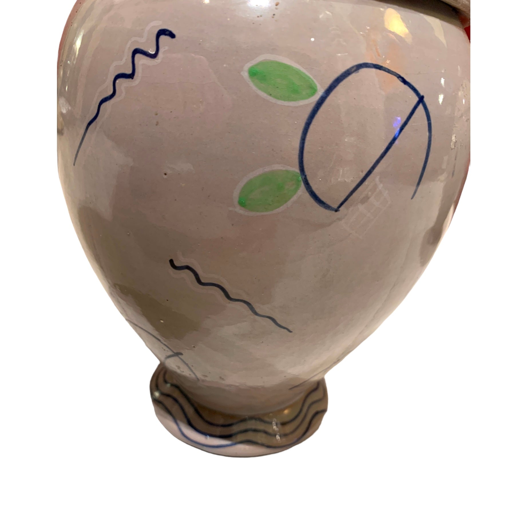 Pair of 1930s dove-grey ceramic apothecaries with green and blue motifs decorating the two vases.