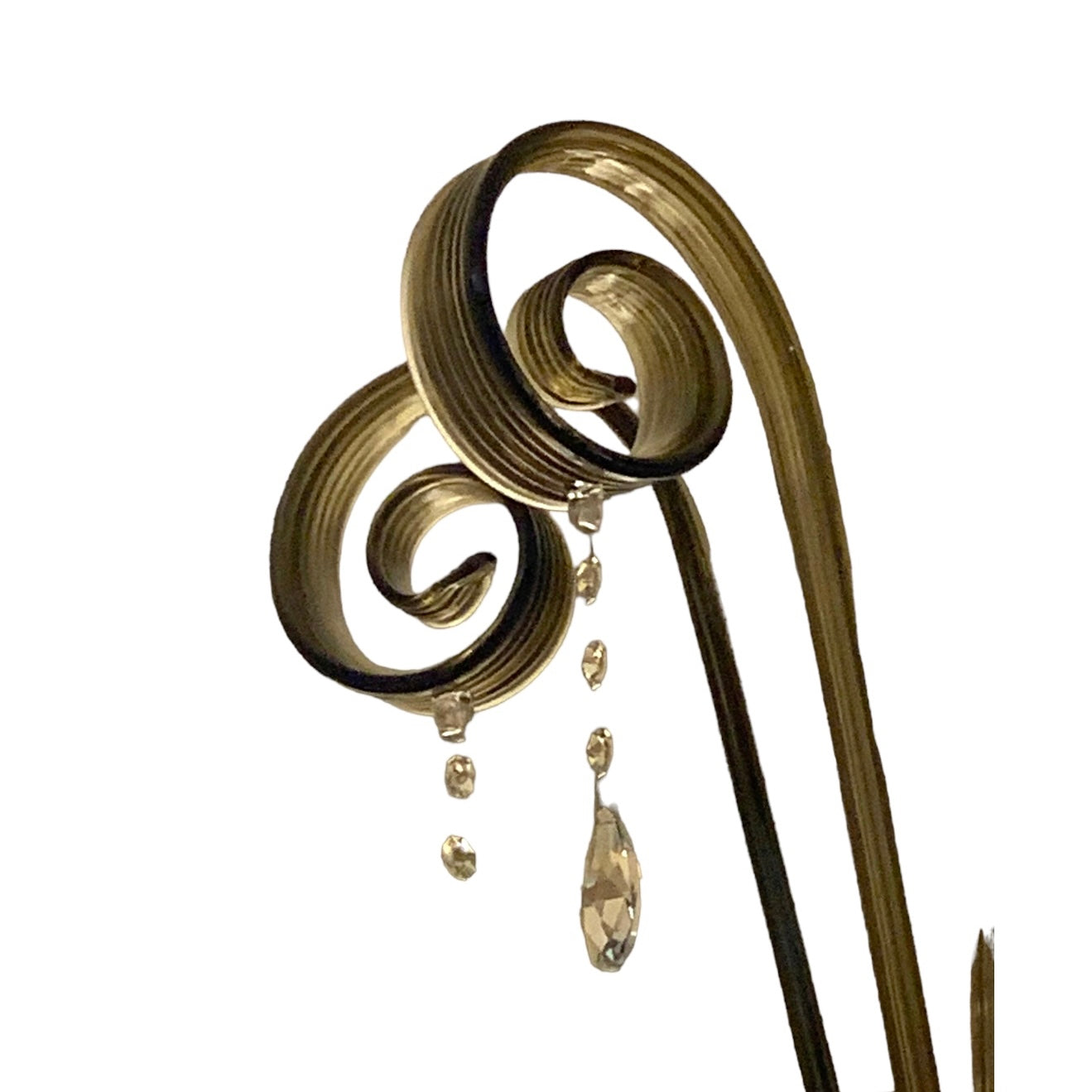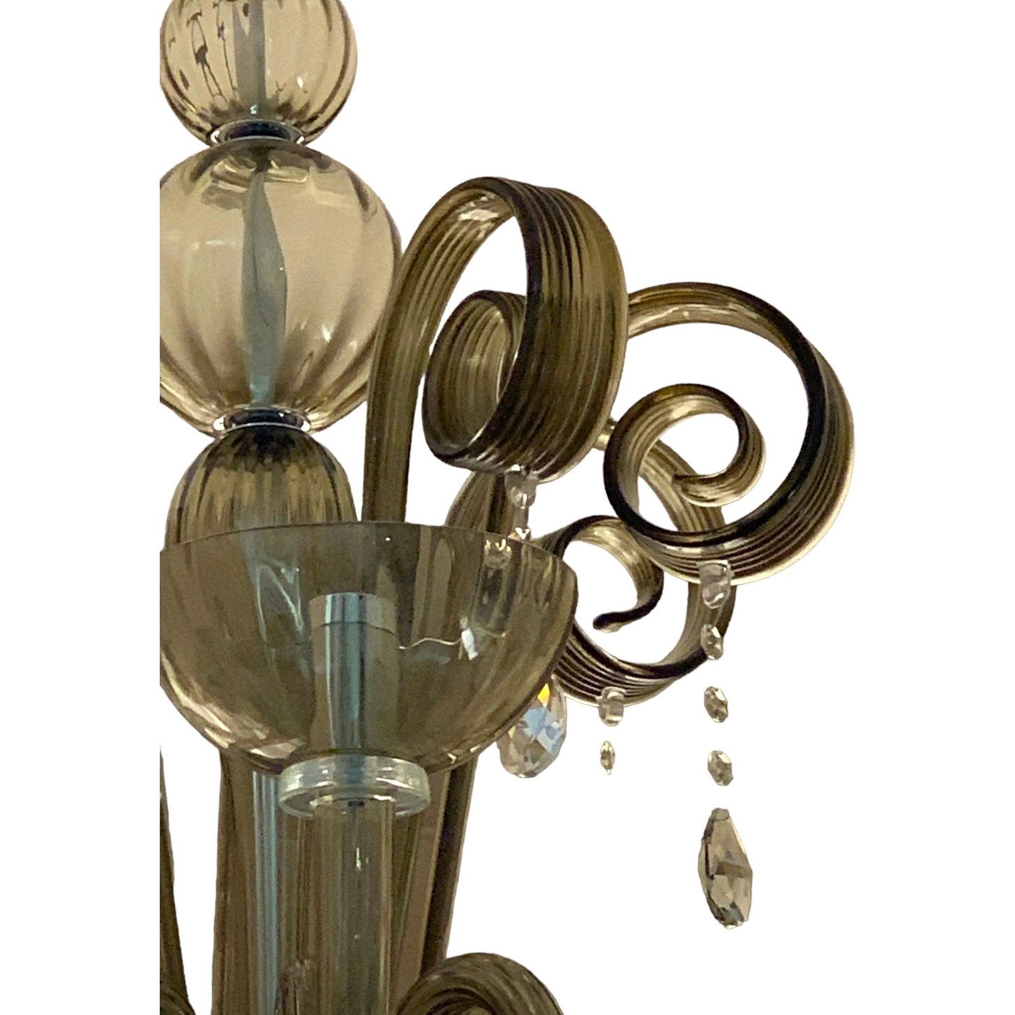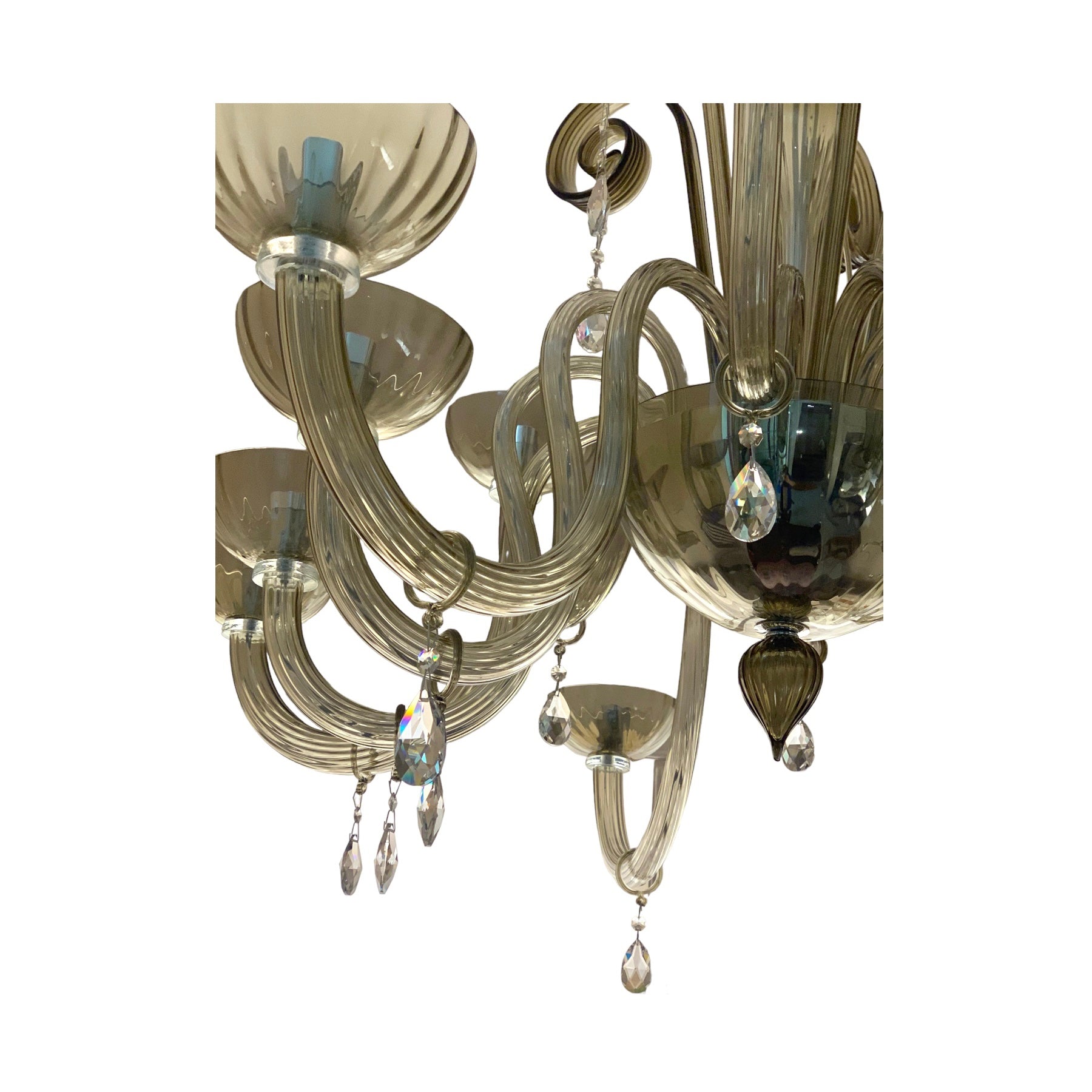 Champagne colored blown glass chandelier with 12 light points. The chandelier is made up of 12 arms of three different lengths arranged alternately to create harmony and movement on the chandelier. The longer arms are more external and the shorter ones in the innermost part. Each arm is decorated with a glass pendant at the top of which is placed a Swarovski crystal. In the innermost part then we find pastorals also decorated with glass pendants and Swarovski crystal. The chandelier is equipped with a double cup.