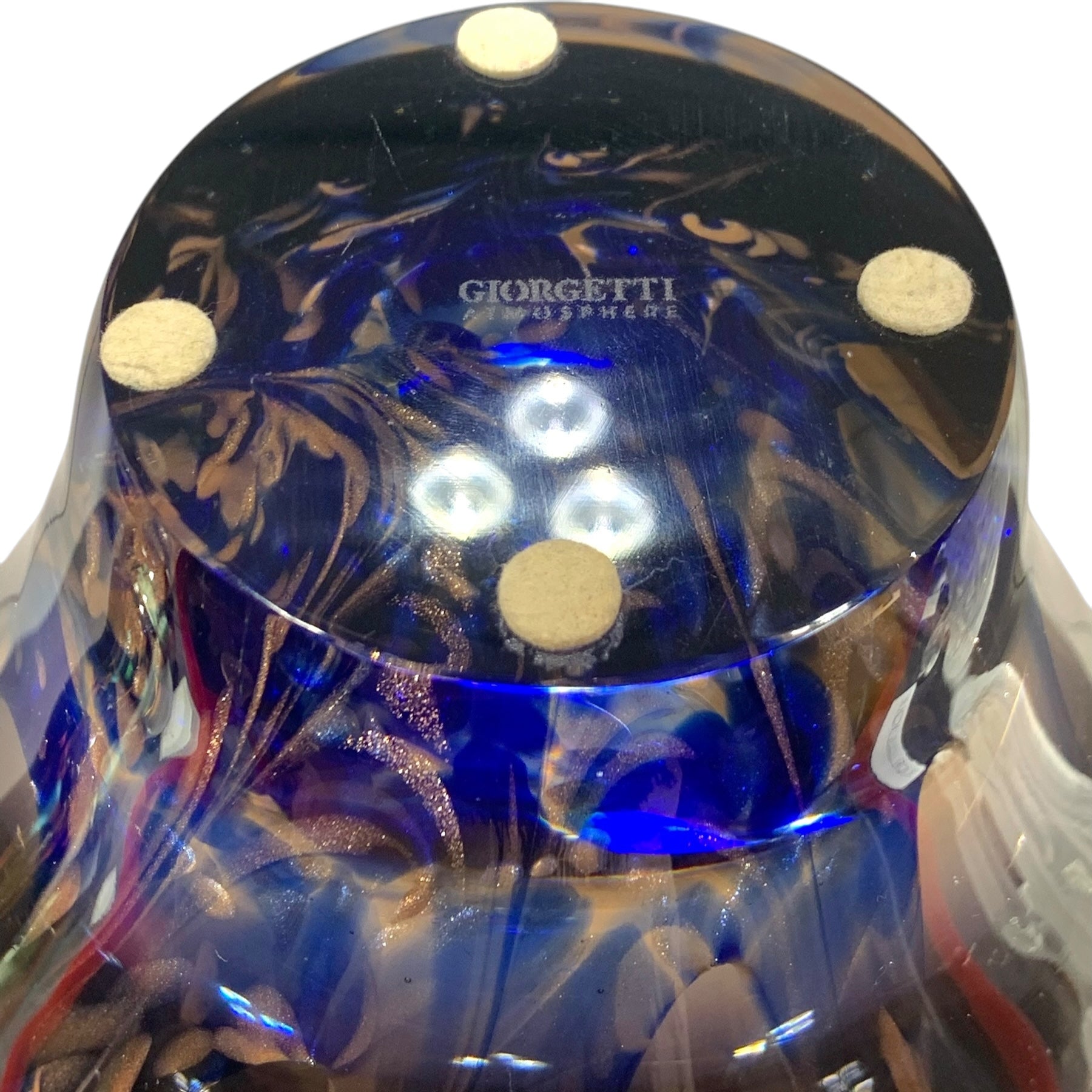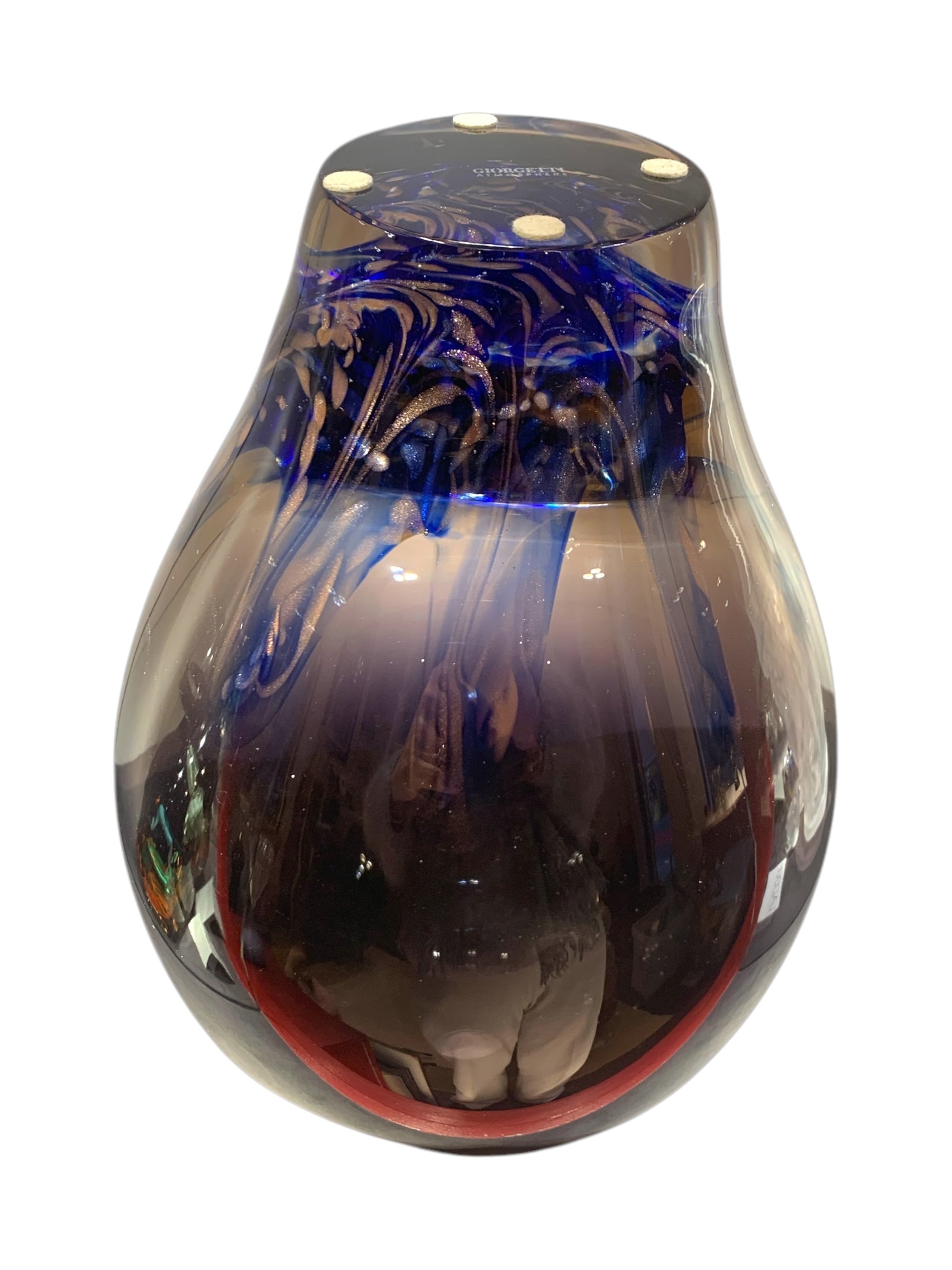 Vaso Ninfa di Giorgetti, lavorazione vetro sommerso. Colore blu scurissimo quasi nero con decorazioni blu e oro visibili anche in controluce.
